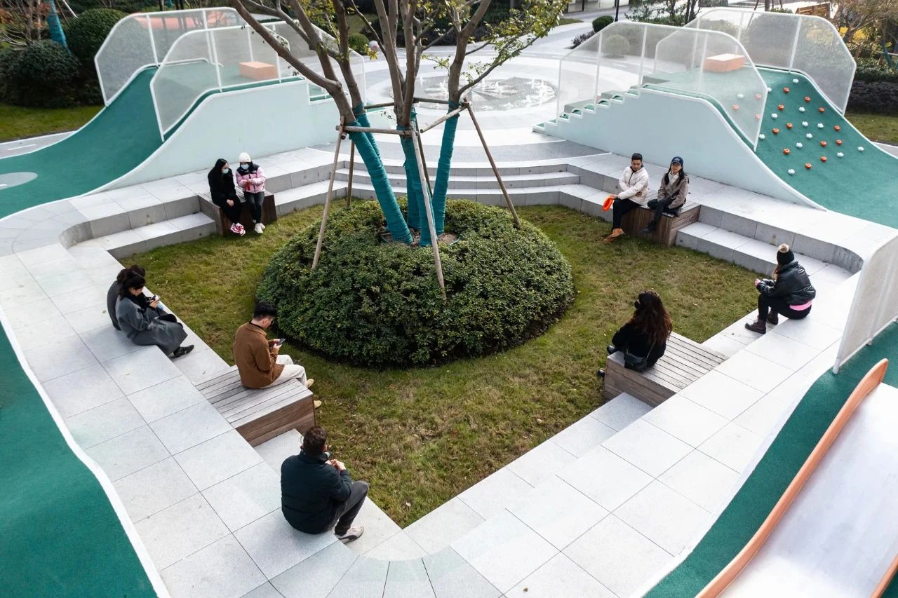 此外,馬字周圍的空白空間也豐富了游玩動(dòng)線,包括不同的休閑迷你廣場(chǎng),以下沉式廣場(chǎng)的形式構(gòu)成座位功能,為兒童和成人提供遮蔭區(qū)域,以及為年輕人和青少年提供的運(yùn)動(dòng)區(qū)或?yàn)閮和峁┑牡孛嬗螒?,將空間轉(zhuǎn)換為多功能的全民廣場(chǎng)。